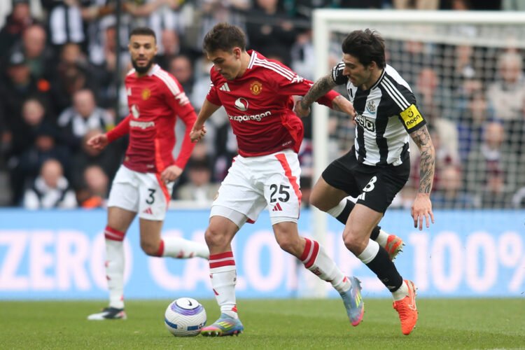 Newcastle United's Sandro Tonali closes down Manchester United's Manuel Ugarte during the Premier League match between Newcastle United and Manchester United at St. James's Park in Newcastle, United Kingdom, on April 13, 2025. (Photo by Michael Driver | MI News/NurPhoto via Getty Images)